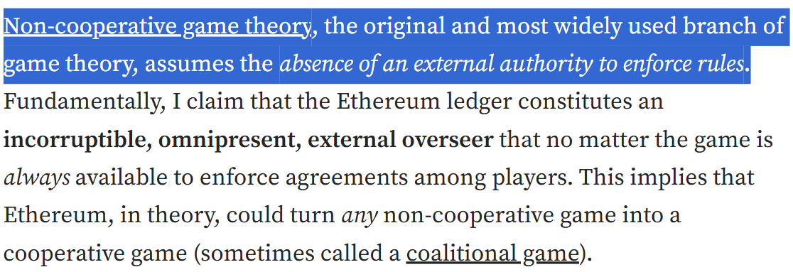 Crypto has a stronger case to be made for a limited use case: digital gold. Because the ledger is public, you can trust it. The code is not something you can crack — crypto is a safe asset which cannot be inflated. This is useful for individuals or corporations who are attempting to safeguard their assets during times of inflation. But when crypto-defenders start inflating the use case, to very general and abstract things like “turning any non-cooperative game into a cooperative one,” they lose me.