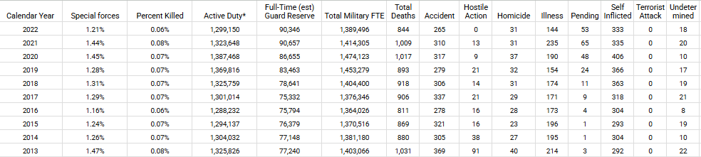 Over the last 10 years, the death rate among active duty military members has remained below 0.08%. These people are not death-defying heroes — they are pencil-pushing bureaucrats. However, if we take number of special forces (70,000), and assume all deaths were among Green Berets, Army Rangers, and so on, then the death rate of 1% is exceeded.4