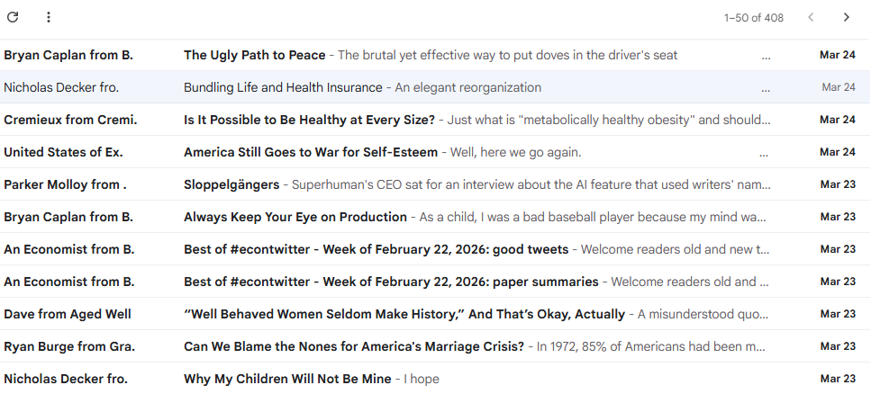 I jinxed myself. I thought, surely, after not getting any action for months, nothing bad will happen after I leave. I will remain a boring, chaste, fuckless Substacker who can start catching up on the 408 essays in my inbox. Specifically, I really want to read best of #econtwitter: paper summaries.