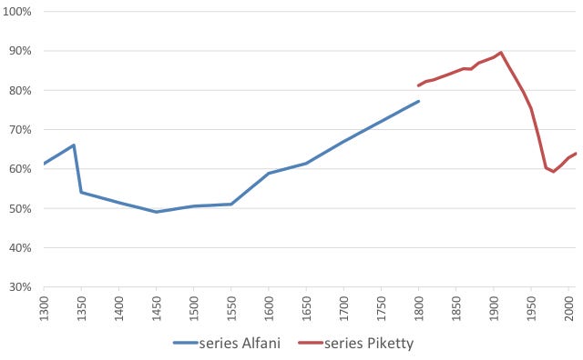 It’s reasonable to argue that, in the 1400s, Europe had relatively low levels of wealth concentration, yet also had high levels of innovation. There are arguments for and against the concentration of wealth. However, it’s important to remember that the bottom 90% of Europeans in 1400 were subsistence farmers and had no innovative capacity at all — there are hard limits on wealth inequality when food is expensive.