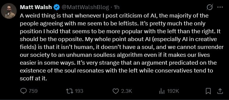 Bernie Sanders is at war with AI. On the right, James Fishback has issued less extreme criticisms, but given that he is disproportionately popular with young Republicans, he acts as a rough bellwether for the direction of the party.