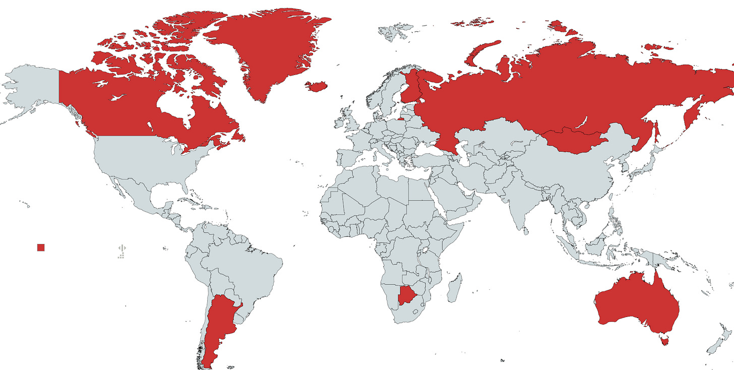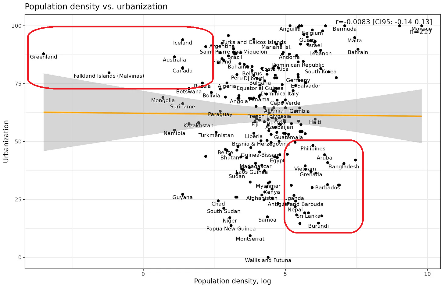 The best of all possible worlds is low density, high urbanization county. The winners of this category include Greenland, Iceland, Australia, Canada, Russia, Botswana, Mongolia, Argentina, and Finland.