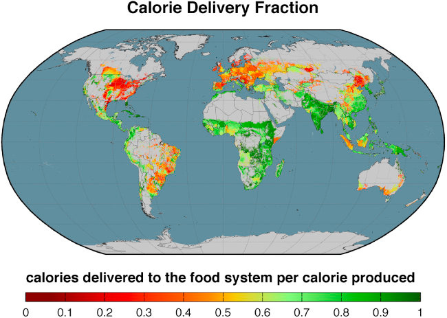 This map essentially shows where calories are abundant, and where they are scarce. Areas of red are where a high percentage of food products are made into animal feed or biofuel (5% of diesel).