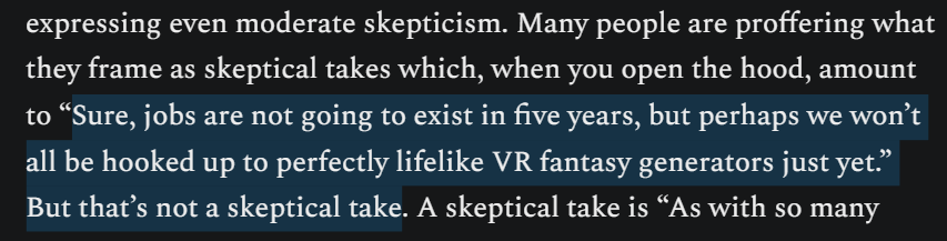 When I criticize Freddie for using the 18% unemployment figure as a test of AI impact, he assumes I am another hypocritical AI maximalist who loves Scott Alexander and promotes the singularity.6 But I’m not. I’m trying to point out that there is a vast difference between maximalism, reasonable skepticism, and dismissive skepticism.7