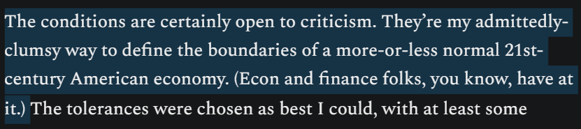 I had the same basic take as you. I don't disagree with Freddie's fundamental premise, but a couple of his metrics for proving things were still basically "normal" were wildly off base. Worse than the 18% total unemployment was the 35% professional/business services unemployment. If we got even 20% unemployment among that specific class, a second great depression is inevitable. That class of people (roughly the top 20% in income) do 60% of all consumer spending in our economy, pay the vast majority of all income taxes, and hold 70% of the nation's assets. If we got anything remotely approaching 35% unemployment, all their spending will screech to a halt (even by the remaining ones with jobs, who will all fear for them), the tax base goes poof, and they will crash all asset classes in a sell off. When their spending stops, everyone else loses their job too. There is zero way to avoid a Great Depression (a worse one, actually) if a third of the high income professional class that do all the spending and pay all the taxes are out of a job, other than massive redistribution and socialism. That would be a massive change. So I agree with him that the kind of stuff he's thinking of is unlikely to happen, but that metric is crazy. We could have 34% white collar unemployment and he would still win the bet and say things are normal. A second (even worse) great depression and/or straight socialism are NOT "normal" for the US!