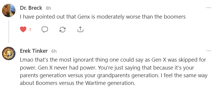 Gen X is a generation with the greatest resentment of any generation. Gen X really hates the boomers. Gen X turned “Boomer” from a neutral term into a slur. This then filtered down to the Millennials and Zoomers. Any time you hear a Millennial or Zoomer blaming Boomers for something, you can rest assured that they learned this blood libel from Gen X.