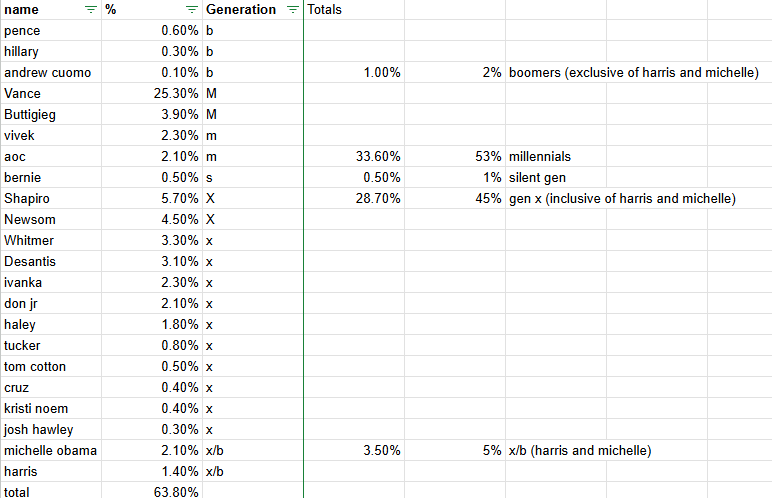 Michelle Obama and Kamala Harris were both born in 1964, which is an edge case. If you count them as boomers, then there is a 1% chance of a Silent Gen president in 2028 (Bernie), 7% chance of a Boomer president, a 40% chance of a Gen X candidate, and a 53% chance of a Millennial candidate.
