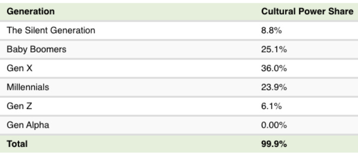 According to the World Economic Forum, the generation with the greatest “Cultural Power Share” is Gen X.