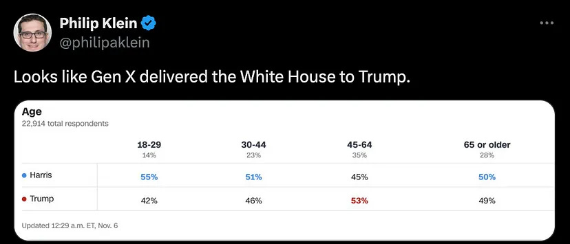 But maybe you think wokeness ended, and we are now in a post-woke era. Well, you’re in luck, because Gen X invented “post-wokeness” too. The demographic that voted the most for Trump was Gen X.