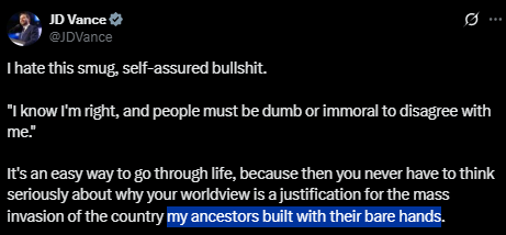 Lastly, on immigration, this is where I think the 4D chess narrative is most plausible over the long term. Vance will say some performatively racist things about “my ancestor”; random Hispanics will end up dead in an El Salvadorian prison; but when the dust has settled, the Trump administration will end up importing enough Indians, Filipinos, and Vietnamese to make up for the loss of a few hundred tortured Germans.
