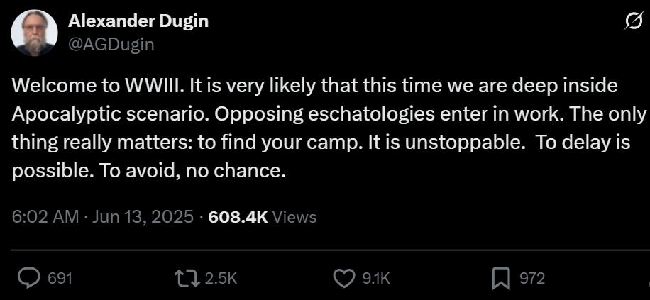 In Defense of Interventionamerican utopianism.DeepLeftAnalysis🔸Aug 12, 2025∙ Paid2354ShareAccording to Alexander Dugin, we are in the middle of the apocalypse:Duginism is libertarianism, writ large. It believes that each little tin-pot dictatorship forms its own “civilization,” and civili…Continue reading this post for free, courtesy of DeepLeftAnalysis🔸.Claim my free postOr purchase a paid subscription.