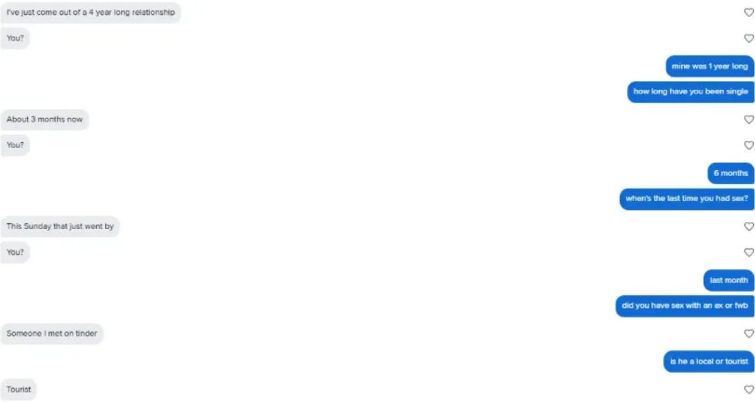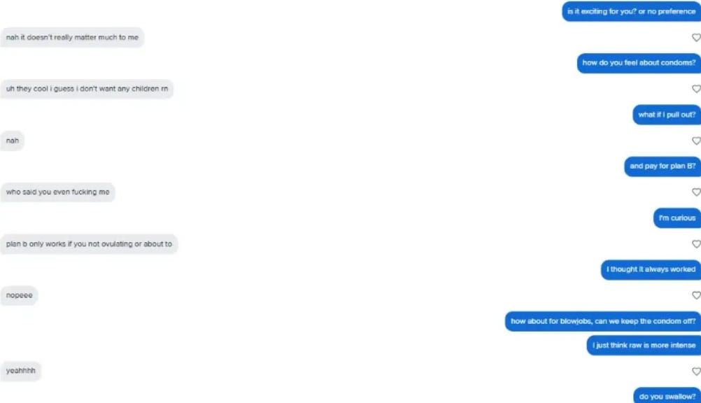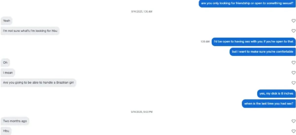 Some of my “wins” are other men catfishing as women. I try to avoid them, but statistically speaking, if I can deceive others, surely I am also being deceived.