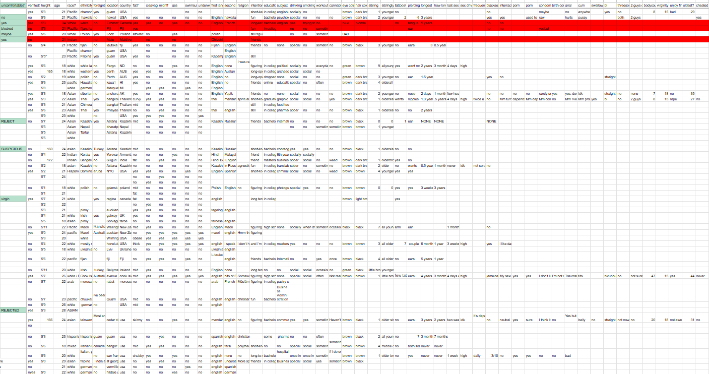 nameuncomfortable?verified?heightagerace?ethnicityforeigntravellocationcountryfat?cleavage?midriffassswimsuitunderwearfirstlanguagesecondlanguagereligionintentioneducationsubjectdrinkingsmokingworkoutcannabiseye colorhair colorsiblingsiblingtypetattoos/piercingslongest relationshiphow long singlelast sexsex drive? compared to friendsfrequency masturbateexcitepornporncondomsbirth controlanalcumswallow?bithreesome2 guys or 2 girls?bodycountvirginityenjoy first time?oldest?cheated?This allows me to make a spreadsheet: