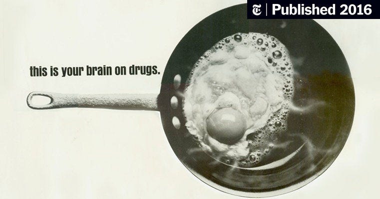 Pictures of degenerated brains are a reference to a 1987 campaign, “This Is Your Brain on Drugs.” The campaign was memorable, and inspired spin-offs and parodies. It was true. Drugs really do cause physical brain damage.