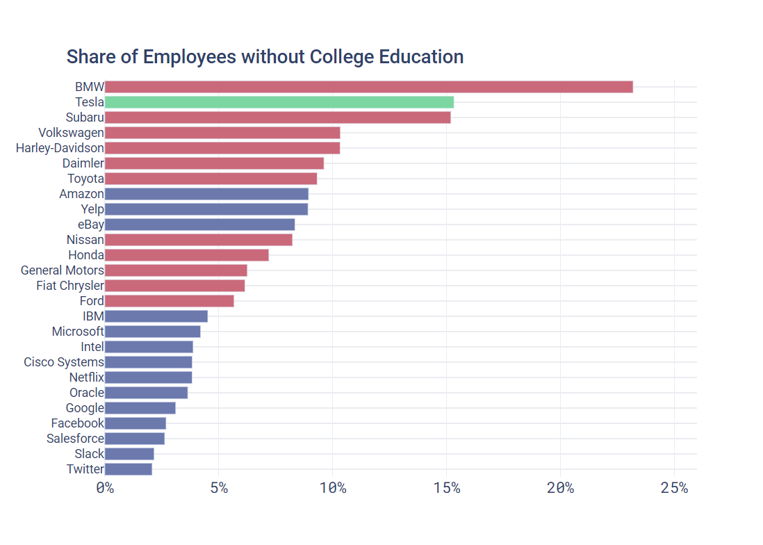 Elon isn’t lying, though, when he claims that he tries to hire more working class people than other manufacturing companies. With the exception of BMW, most automotive companies discriminate much more than Tesla in favor of college degrees:
