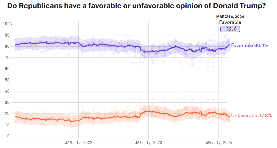 Despite the sadistic glee that Trump is providing the right, his favorability is down, and is not likely to increase. This is because Trump can’t do much to increase his favorability among Republicans — he is already “maxed out” at his historical ceiling of 80%. His decline in favorability isn’t evenly distributed throughout the population, but a result of moderate, independent, and liberal voters becoming alienated from him. Those are the voters that matter in the midterms.
