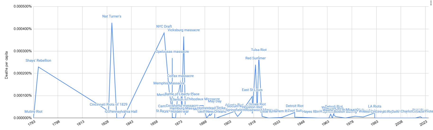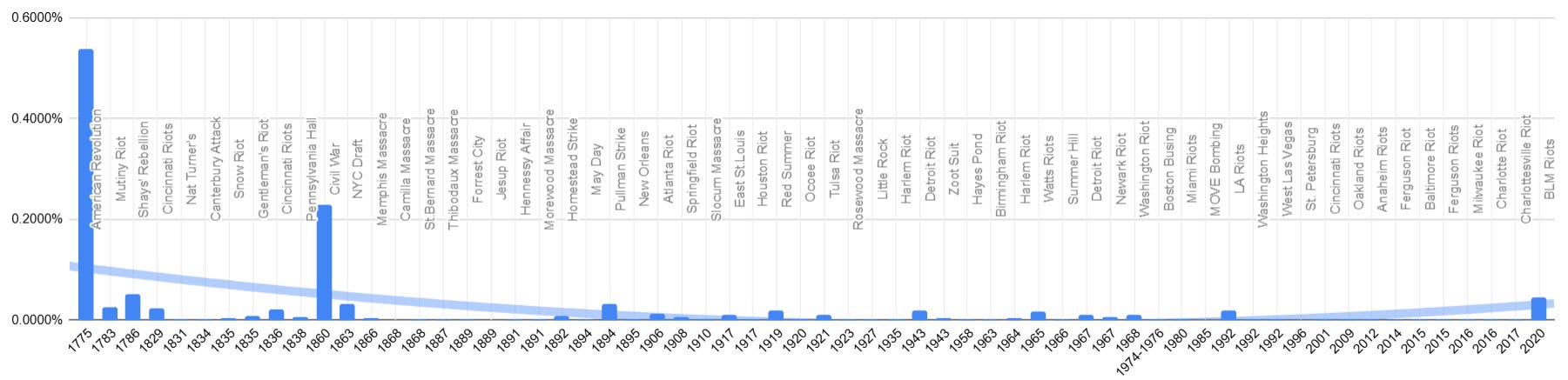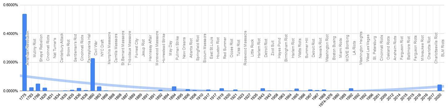 If the trend continues, we should expect another “extremely significant” riot, similar to BLM, by 2050. Given the minimum period of 11 years, it is possible that another “extremely significant” riot could occur by 2031. The worst riot of all time was Shays’ Rebellion, and if something of that scale that happened today, it would involve 194,947 people.3