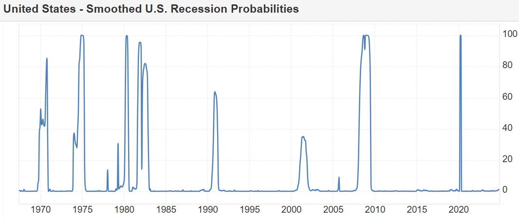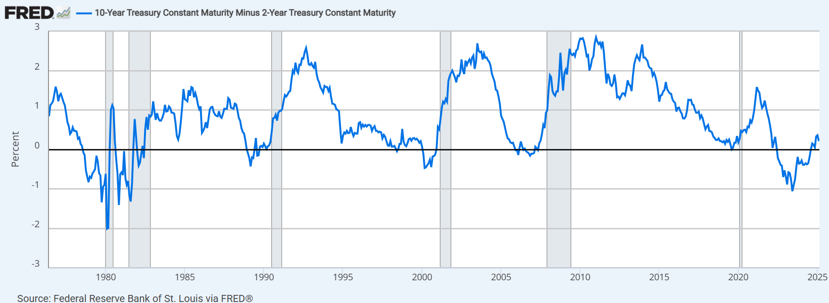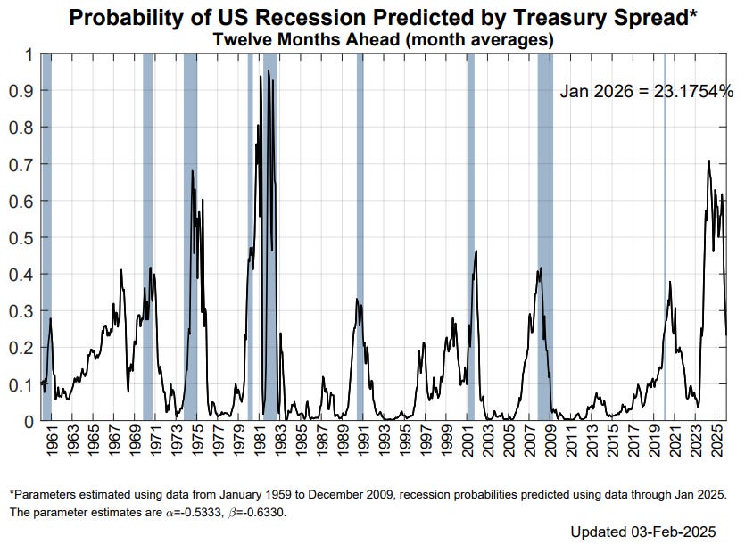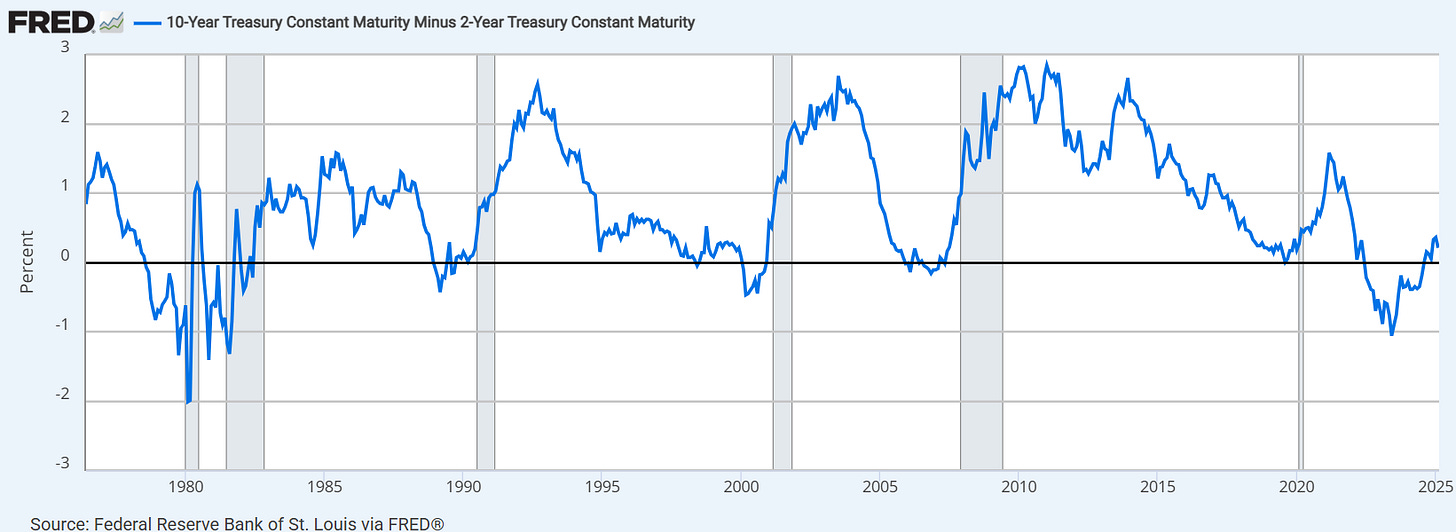 He wasn’t alone. From 2022 to 2024, most economists were predicting a recession. This is in part due to the 10-2 treasury yield. I won’t explain the mechanism behind this predictor, but the pattern to watch is that every time the 10-2 TY falls below 0, there is usually a recession to follow. This as the case in the 80s, in the 90s, in the 00s, in 2008, and it even predicted the COVID recession of 2020.8