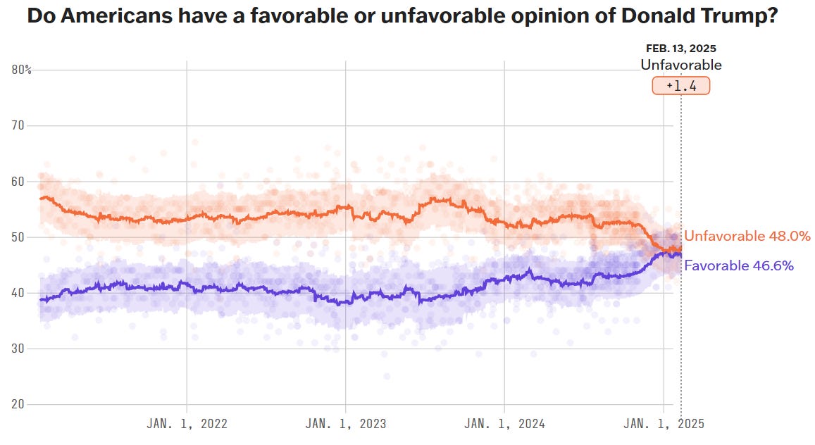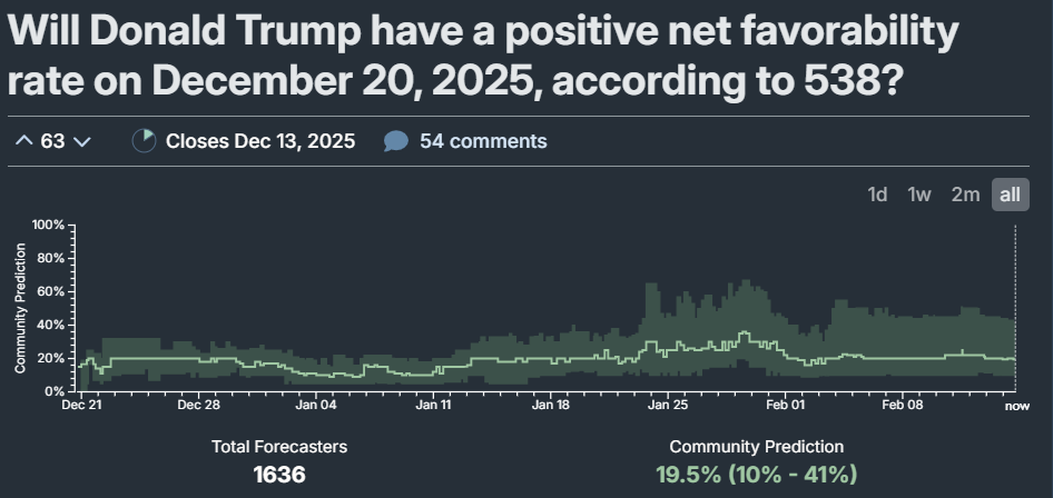 But despite these “successes,” Metaculus shows a small chance of a positive approval rating by the end of 2025. Here’s Trump’s current favorability:
