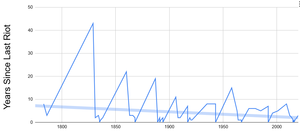 10 years is a long time for no riots to occur at all. The frequency of small riots has been increasing over time, possibly due to increases in literacy, newspaper distribution, radio, television, and now the internet and social media. In total, the average time between riots is 3.51 years.