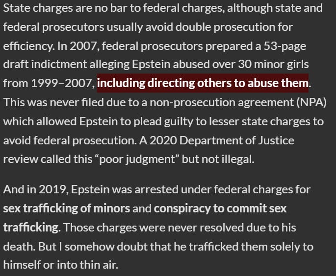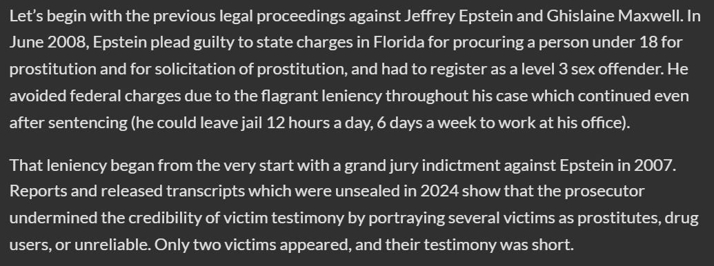 First of all, Zsutty’s logic is working in reverse. The reason why the plea deal was “lenient” is because the case against Epstein was profoundly weak. It involved adult prostitutes, as well as serial liars, drug users, and schizophrenics. The main witness. Virginia Roberts Giuffre, was profoundly unstable and unreliable. She contradicted herself pathologically. In order to secure a conviction, the state had to work with Epstein to negotiate a deal. Otherwise, there is a strong case to be made that the state would have failed to secure a conviction entirely.