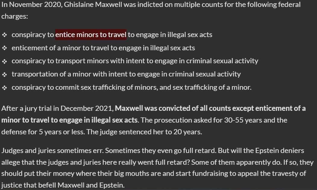 Zsutty then claims that if Epstein deniers were serious, they would raise money for Ghislaine Maxwell. I would be happy to do this personally, except that I am poor. I do not believe that any of the people who are Epstein deniers are very rich. The money is all on the side of the maximalists, who are getting multi-million dollar payouts and Elon-bucks from their salacious tweets.