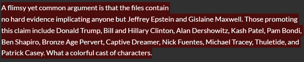It is very easy for me to attack Epstein maximalists. Candace Owens is a low-IQ schizophrenic; the supposed “survivors” are prostitutes; Dave Smith is a House Jew who does not read.