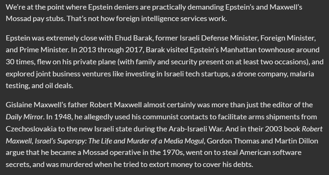 Zsutty completely omits the fact that Ehud Barak was the enemy of Netanyahu, and that Maxwell died under mysterious circumstances in connection with Israel. This betrays either ignorance or an intention to withhold crucial information to avoid contradicting his predetermined narrative.
