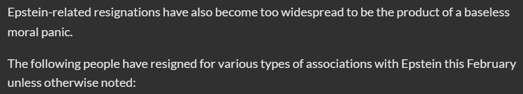 Zsutty claims that if people are forced to resign over the Epstein panic, that means we know that the most salacious claims are true. That is false. That is not how moral panics work.