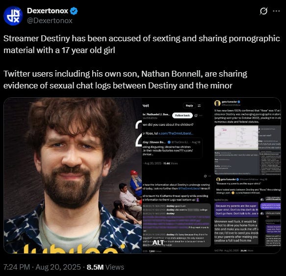 Remember, I’m defending Destiny here. My point is that, yes, of course, Destiny is a naturally revolting figure, but he isn’t revolting because he sexted a 17 year old girl. Had he castrated himself and purged himself of all sexual impulses, he would still be naturally revolting. The sexting of the 17 year old is entirely besides the point.