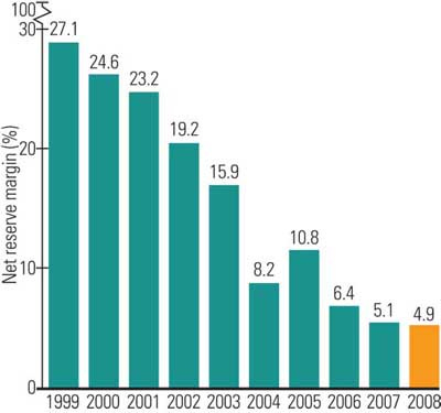Since 1999, South Africa has seen a dramatic reduction in its reserve margin. The reserve margin is the amount of unused capability of an electric power system during peak usage as a percentage of total capability.5