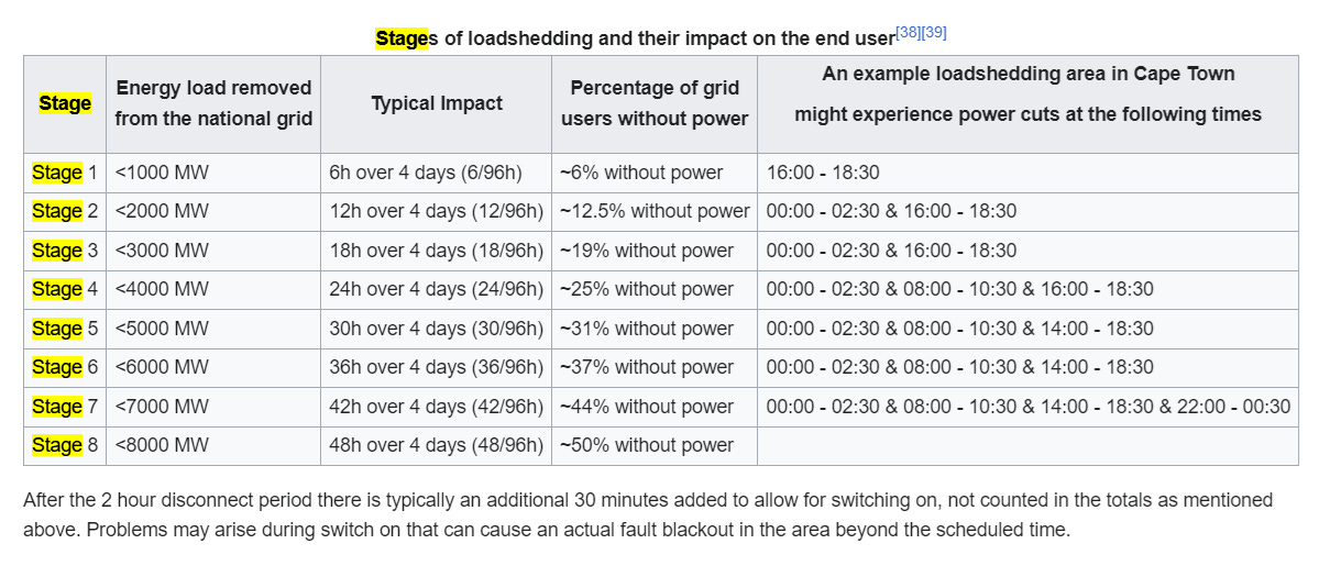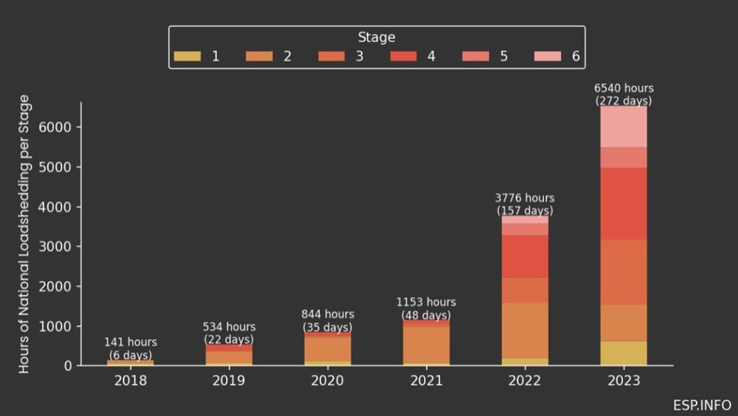 Although both Medupi and Kusile both became fully operational in 2021 and 2022, South Africa’s blackouts have gotten worse and worse. Since 2019, South Africa has set all-time records for increasing hours of blackout, with each year since then beating the old record. In 2023, South Africa was experiencing blackout conditions 3 out of every 4 days. Stage 6 blackouts, which were introduced in 2019, represent blackouts where 37% of the country is without power. In 2023, thieves destroyed electrical infrastructure in order to steal parts and scrap metal, with incidents of theft being noted several times a week, without any successful counter measures from law enforcement.15