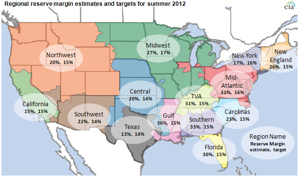 In America, reserve margins generally fluctuate between 36% and 14%.6 In China, reserve margins have been built higher to accommodate expected economic growth, averaging 28%, but in some regions as high as 64%.7