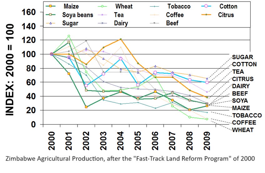 One stark example of how low human resources causes famine is the “Fast-Track Land Reform Program” in Zimbabwe, first enacted in the year 2000.3 The program was an armed insurrection against legal landowners, who were overwhelmed by sheer numbers, kidnapped, tortured, killed, and dispossessed of their land.4 The farms were taken over by militant gangs with lower human resources than the farmers they expelled. As a result, over the next 9 years, agricultural production fell from a minimum of 35% (sugar) to a maximum of 90% (wheat).