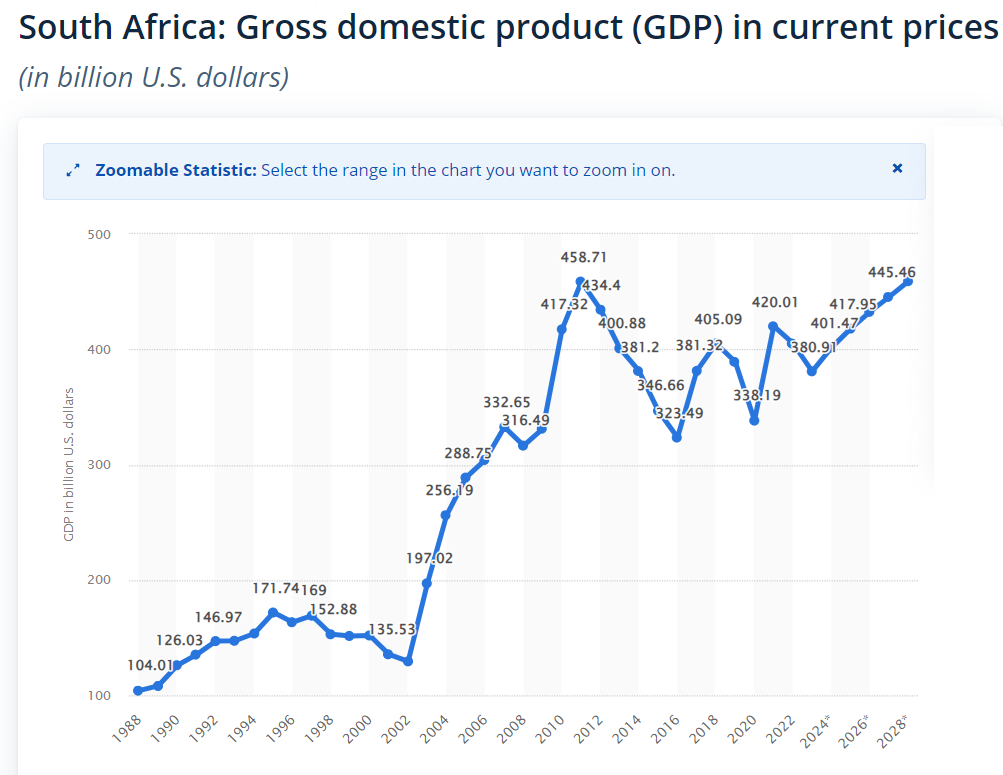 The lifting of sanctions and massive influx of cash between 1993 and 2007 entirely explains and accounts for South Africa’s post-apartheid growth. However, after foreign aid stopped exponentially increasing in 2011, and with the post-sanctions boost evaporated, South Africa has begun a 13 year long descent into de-industrialization. Since 2018, the pace of de-electrification has intensified, reaching record new levels with every year, leaving between 6% to 37% of South Africans without power for 6 to 36 hours every four days. Nuclear power has been offered as a solution, but the earliest plants are not scheduled to come online before 2033. The crisis which has only grown since 2018 can be symbolized by cultural changes. Since 2017, South Africa has not featured any women of European descent in their Miss South Africa beauty pageants, reversing the trend set first in 1956.