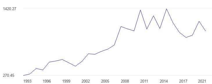 At the same time that the sanctions were lifted, South Africa received a massive influx of global investment between 1993 and 2011.17 Foreign aid increased from $270 million per year to over $1.4 billion per year around 2011. Since 2011, increases have stalled and, as a result, the South African economy has lagged behind the global average. While global GDP growth has remained above 2% on average since 1994 (with the exception of 2009-10 and 2020), South African GDP growth has stalled and fallen well below the global average since 2010.