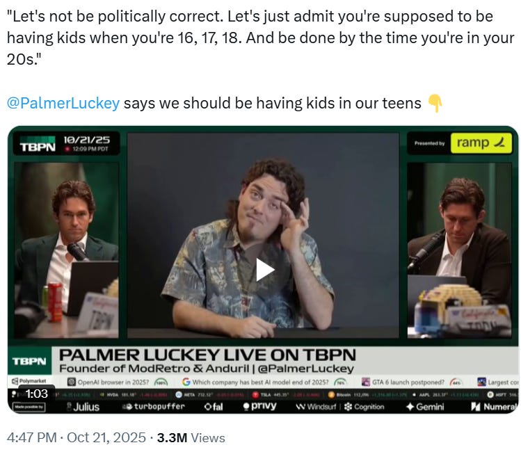 Palmer Lucky recently claimed that it is natural for girls to have children starting at age 16, and to then be finished having kids around age 30. This doesn’t align with the historical data: most data we have places the median age at first child birth between 20 and 26, and the median for last birth centers on 35. There are of course exceptions -- some 13 year olds gave birth, and some 40 year olds give birth -- but if we are speaking normatively, 16-30 is not the historical range.