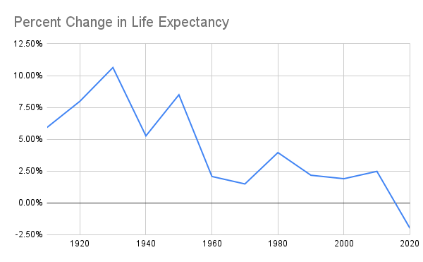 If we assume that the decline in American life expectancy between 2010 and 2020 is part of a larger trend, then we could hypothesize as follows:
