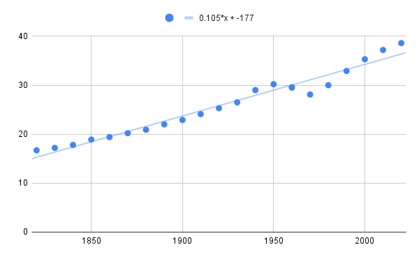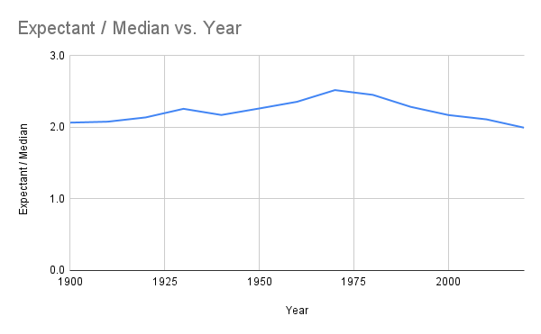 For the years 1900 to 2020, the relationship between median age and life expectancy ranged from an early low of 2.07 in 1900, a recent low of 1.99 in 2020, and a high of 2.52 in 1970. Again, the high of 2.52 in 1970 was not due to a rapid increase in life expectancy (that occurred in 1950), but rather due to a rapid increase in fertility. Since fertility generally declined between 1820 and 1960, we should not expect the relationship between life expectancy and median age to dip far below a factor of 2.0.