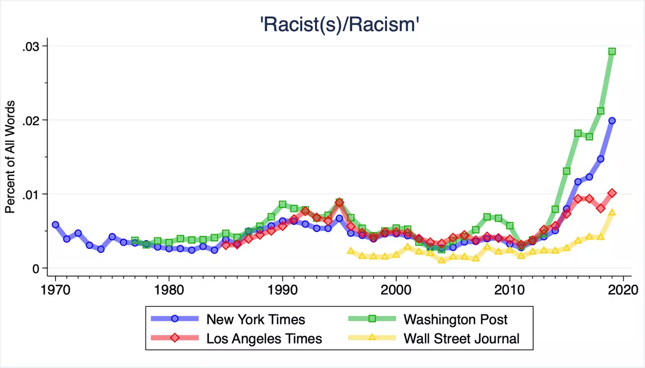 The “breakout” even of “wokism” occurred in 2015, when mentions of racism in the mainstream media exceeded any previous metric since 1970.
