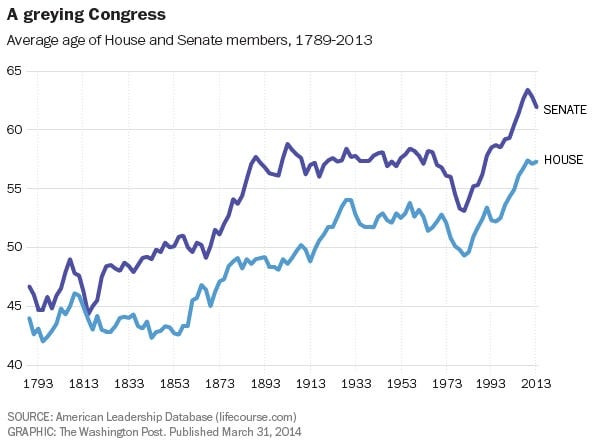 The average age of congress is now 64. The earliest memories of this cohort would be 1960. Although congresspeople were younger in the past, if we regress using the year 64, we find that the last congress which could have fought in WWII, on average, was in 1997. The congress which will (on average) move beyond the Fall of Saigon will convene in 2027. The last congress to have been able to volunteer for Reagan’s reelection campaign will come in 2036.