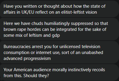 All of this is ugly. I have been told directly by women traveling in England that they were accosted by a Pakistani man on the bus and shown porn on his phone. This was an unfortunate situation, and in a perfect society, this man would have been deported to Haiti. England is not a perfect country.