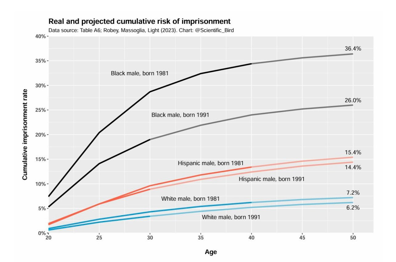 The black male imprisonment rate is 26% for the 1991 cohort, as opposed to 6.2% for whites. This means that black males in America are 4.2x as criminal as white males in America.