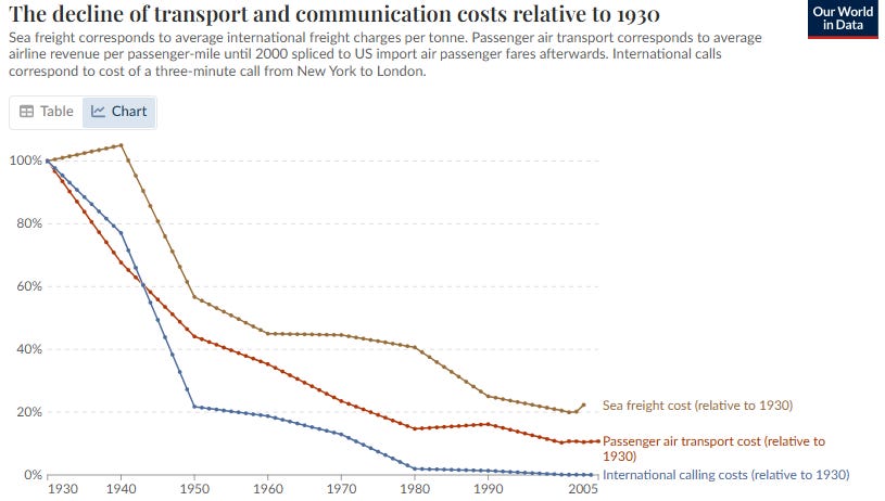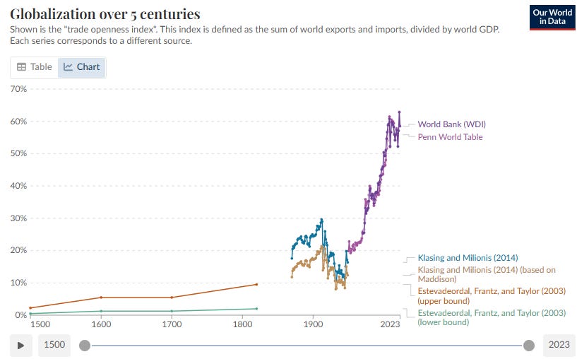 There is a clear correlation between wealth, trade, and security centralization, represented by the age of colonial empires which began in 1492. Two World Wars sent global trade back 100 years, and destroyed the economies of central and eastern Europe. The political instability of Germany and Russia was caused by the First World War, and that instability lead to the Second World War.