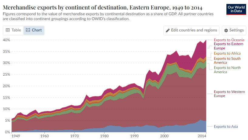 At first, the Soviet Union was bad for eastern Europe, because it destabilized the region, resulted in sanctions, and centrally planned the economy. However, after 1950, the Soviet Union gradually increased trade, which helped balance out some of the negative aspects of communism. Independent of domestic policy, having a stable security situation is good for trade.
