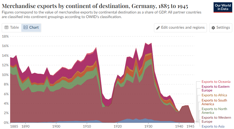 The relationship between security and trade is a feedback loop. When Hitler planned to conquer eastern Europe, he massively increased tariffs in order to prepare the economy for the loss of imports. These tariffs resulted in reciprocation, which reduced German exports. By 1938, German imports had already reached war-time levels. Trade requires security, and trade provides security.