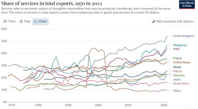 It’s not often understood just how much of the global economy is intangible, that is, the transference of services rather than goods. China has been locked out of this sector because the language of global services is English. Perhaps the linguistic distance between Chinese and English makes the communication economy difficult for Chinese; or perhaps the Chinese government wants to prevent its citizens from communicating with the outside world.