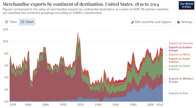 It is frequently claimed that America used to be a huge exporter, and we just don’t export anything anymore. This isn’t true! Outside of brief spikes in 1870 and 1917, American exports are above the historical average since 1839.