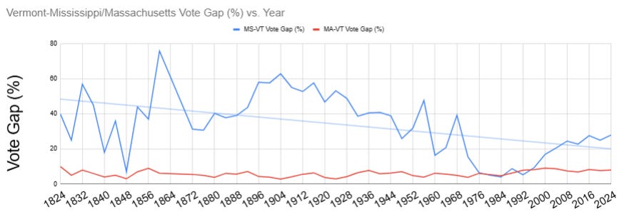 There are two political parties in America. The Vermont Party, and the Mississippi Party.