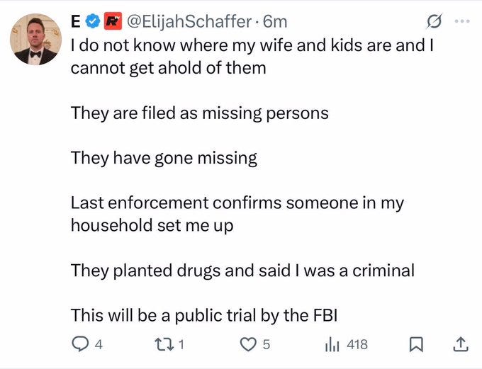 Elijah Shaffer is a right-wing podcaster. He began posting erratic messages to Twitter, claiming things like âmy family has been kidnapped by the FBI.â Given what we know now, there are two ways to interpret this:
